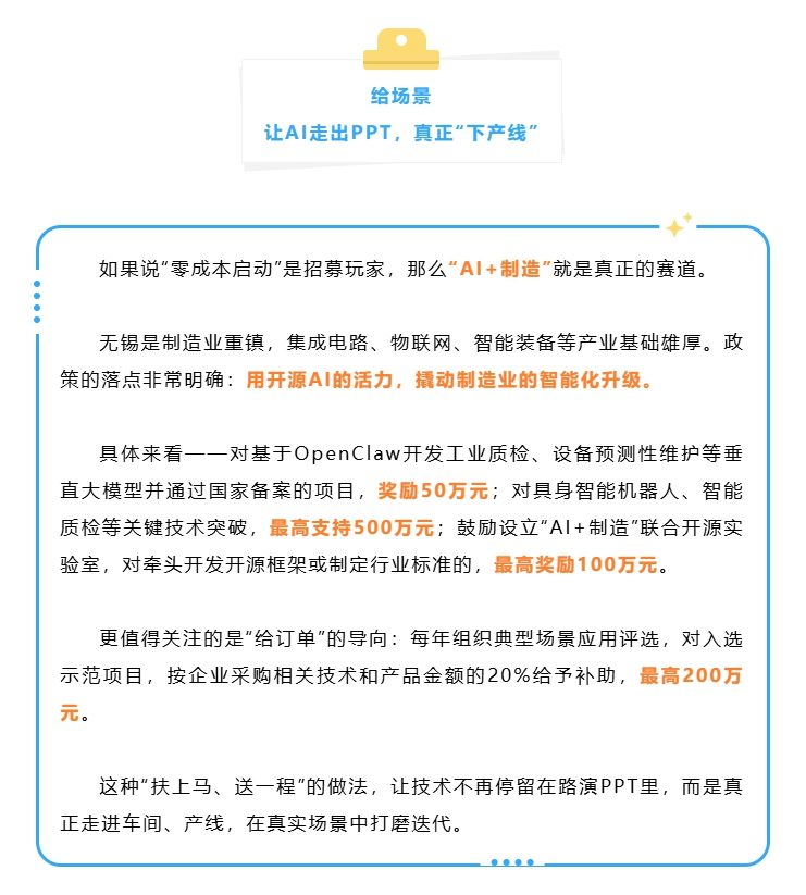 无锡高新区发布《关于支持OpenClaw等开源社区项目与OPC社区融合发展的若干措施(征集意见稿)》。12条“养龙虾”政策,从基础支持到产业落地,从人才引育到安全合规,单项支持最高达500万元。