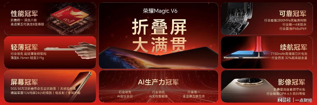 凭借荣耀在折叠屏上的突破性技术创新,荣耀Magic V6实现了屏幕、可靠、轻薄、续航、性能、影像、AI生产力七大维度夺冠,无论硬件实力还是软件体验,均实现全维度拉满,铸就折叠屏全能大满贯。