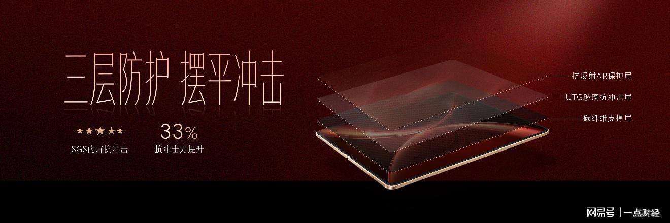 内屏同样有至臻黑钻屏旗舰素质。全新升级超韧UTG玻璃,折痕相比上一代产品改善44%,通过了SGS无感知折痕认证,呈现出仿佛没折的平滑效果。同时,通过碳纤维支撑层、UTG玻璃抗冲击层、抗反AR保护层等三层防护,抗冲击力提升33%,由内到外,可靠属性拉满。