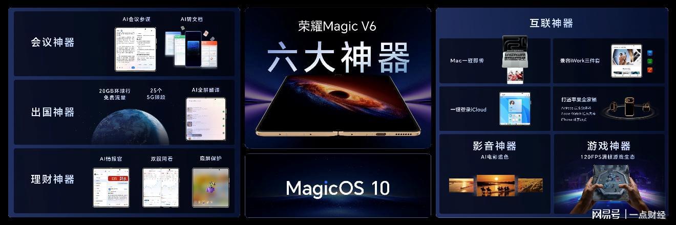 如果说硬件实力决定折叠屏的性能边界,那么AI和生态等软件能力则决定折叠屏的好用程度。此次荣耀Magic V6不仅在硬件创新上实现“全满贯”,在软件配置上也同样能打。荣耀Magic V6带来会议、理财、出国、影音、游戏、互联六大场景的“六大神器”软件体验。