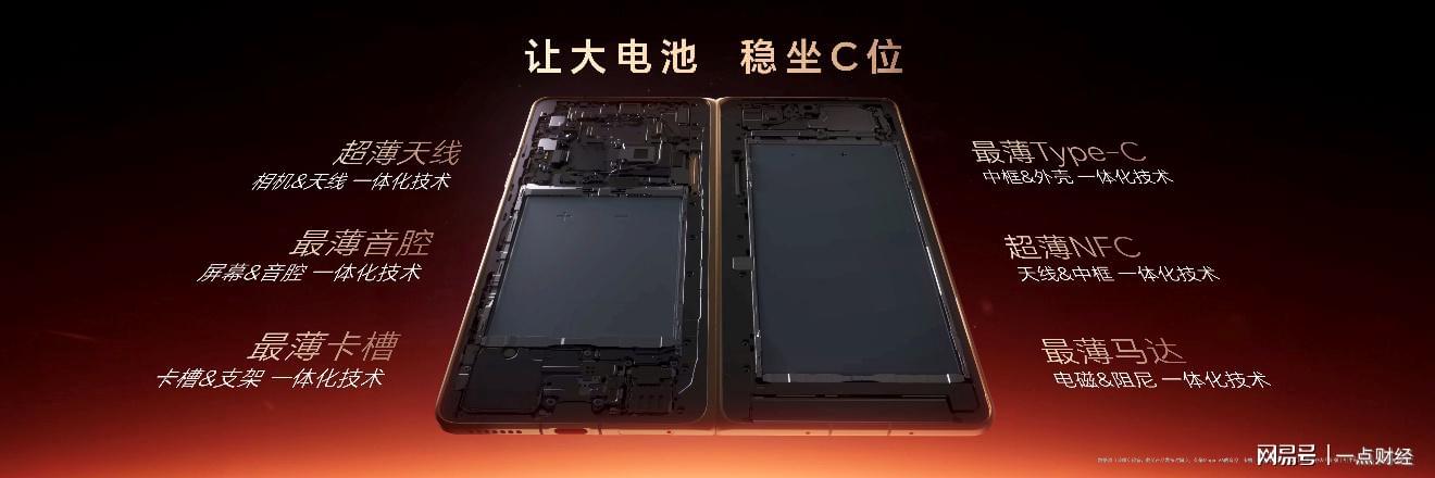 在内部设计方面,为了在极限空间里给电池留下足够空间, 荣耀Magic V6针对内部空间做了系统性考量,对天线、音腔、卡槽、Type-C、NFC、马达等组件进行极致轻薄化处理,让电池稳坐C位。