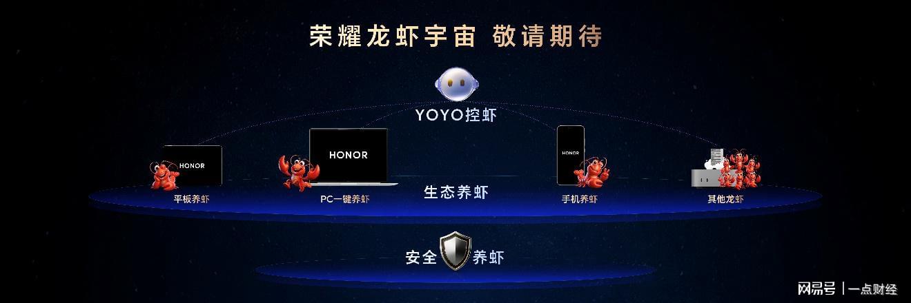发布会上,还公布了生态级的荣耀龙虾宇宙,支持PC一键养虾、平板养虾,未来还能兼容其他生态设备的龙虾接入。用户可以通过YOYO在荣耀手机上直接和小龙虾交互,并安全地开放手机智能体供小龙虾调用,实现生态养虾、安全养虾和YOYO控虾三大能力。这些功能将于近期陆续开放内测。