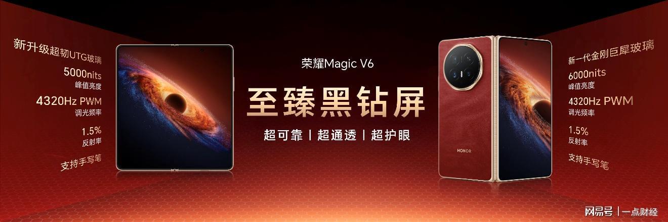 荣耀Magic V折叠屏系列自诞生之日起,就在不断刷新折叠行业品类上限。此次荣耀Magic V6不仅在极致轻薄上持续引领,更首次将折叠屏电池容量带入7000+mAh时代,续航实力跨代领先。内外均采用荣耀自研至臻黑钻屏,国际顶级七大权威认证诠释顶级屏幕素质。全新荣耀盾构钢铰链和超强整机防尘防水,将可靠性拉满。同时,凭借满血性能和出色影像配置,以及全新AI生产力和跨生态互联体验,带来从内核到外观,从硬件到软件的“折叠屏大满贯”实力。