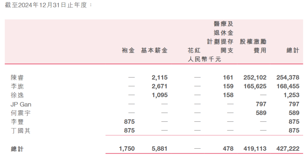 回看2024年更夸张,陈睿年薪2.54亿,其中99.1%是股权激励;李旎年薪1.68亿,98.8%是股权激励。