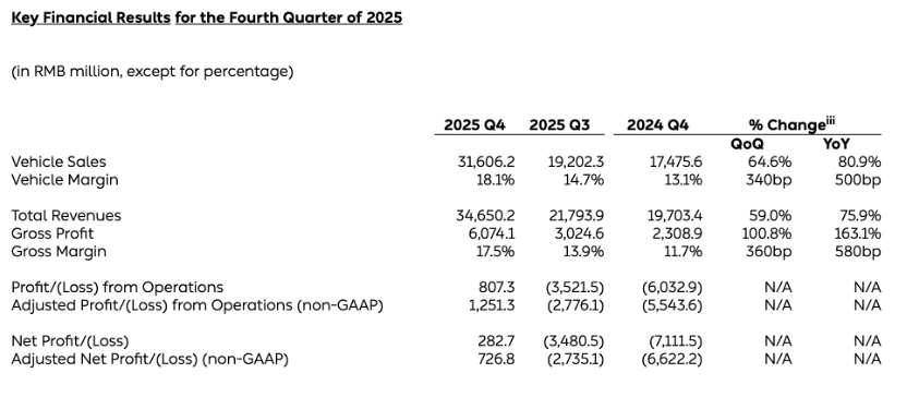 3月10日,蔚来(NIO.US,09866.HK)发布2025年第四季度及全年财务业绩,2025年第四季度该公司实现营收346.5亿元,同比增长75.9%,创历史新高。第四季度净利润为2.83亿元,实现公司成立以来首次单季盈利,相比之下,2024年同期净亏损71.12亿元;non-GAAP 经调整净利润7.27亿元,2024年同期为净亏损66.22亿元。