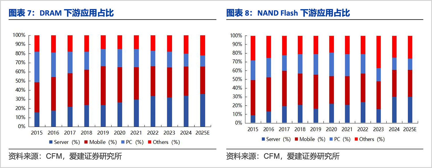 CFM的数据显示,2024年,DRAM与NAND下游需求主要由服务器主导,智能手机和PC的占比在萎缩。DRAM领域中服务器的占比更是达到34%,超过了智能手机的32%和PC的14%。