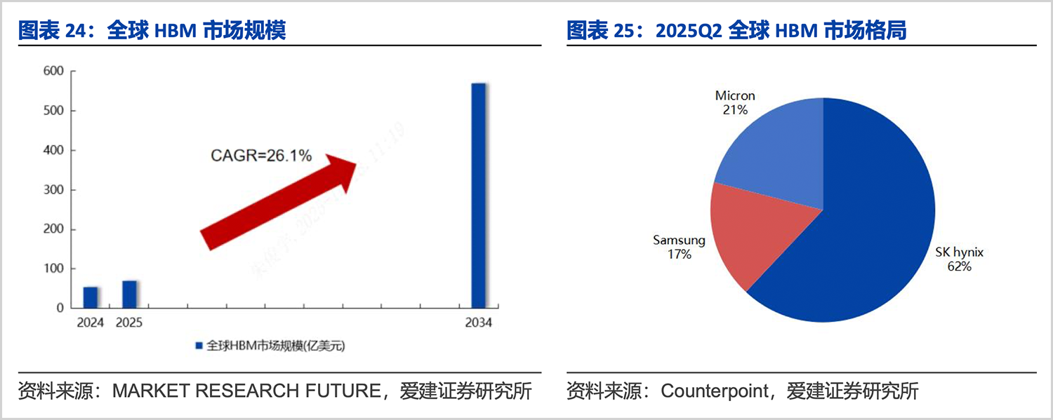 其中SK海力士具有先发优势,其于2023年8月就推出HBM3E产品,并计划推进HBM4的研发。2025第二季度,全球HBM江湖被三巨头把持,占比分别为62%、21%和17%。