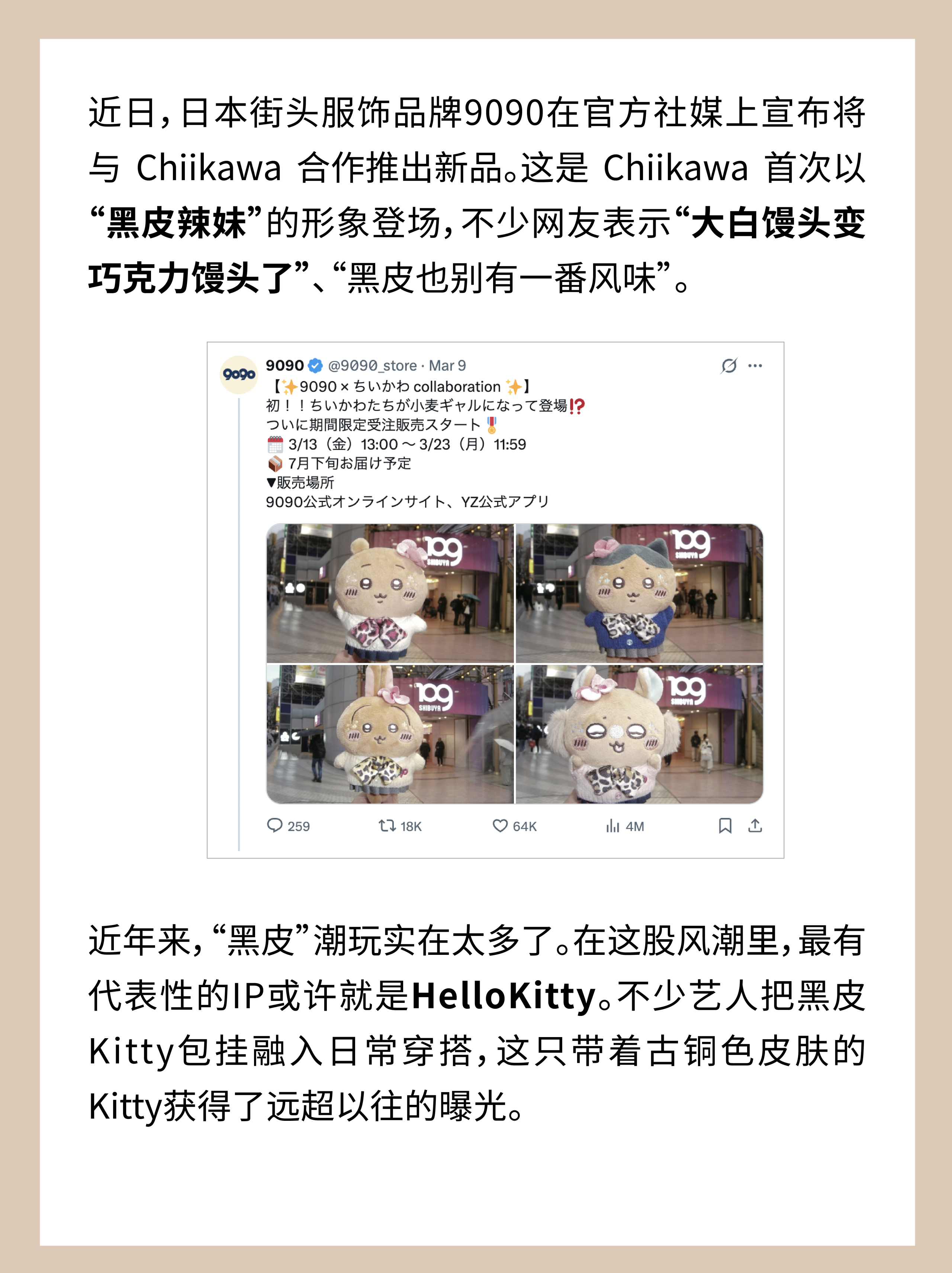 近日,日本街头服饰品牌9090在官方社媒上宣布将与 Chiikawa 合作推出新品。这是 Chiikawa 首次以“黑皮辣妹”的形象登场。