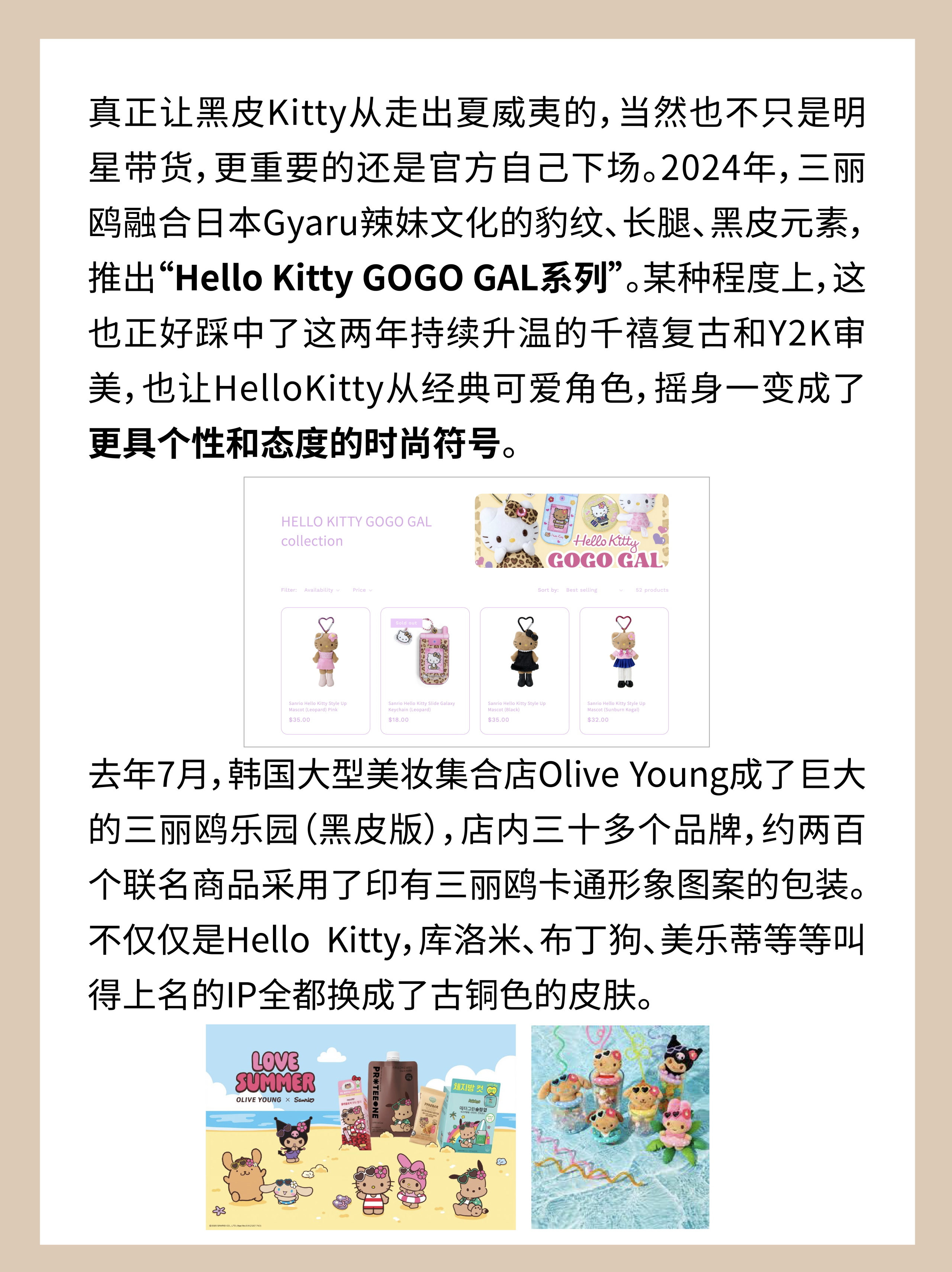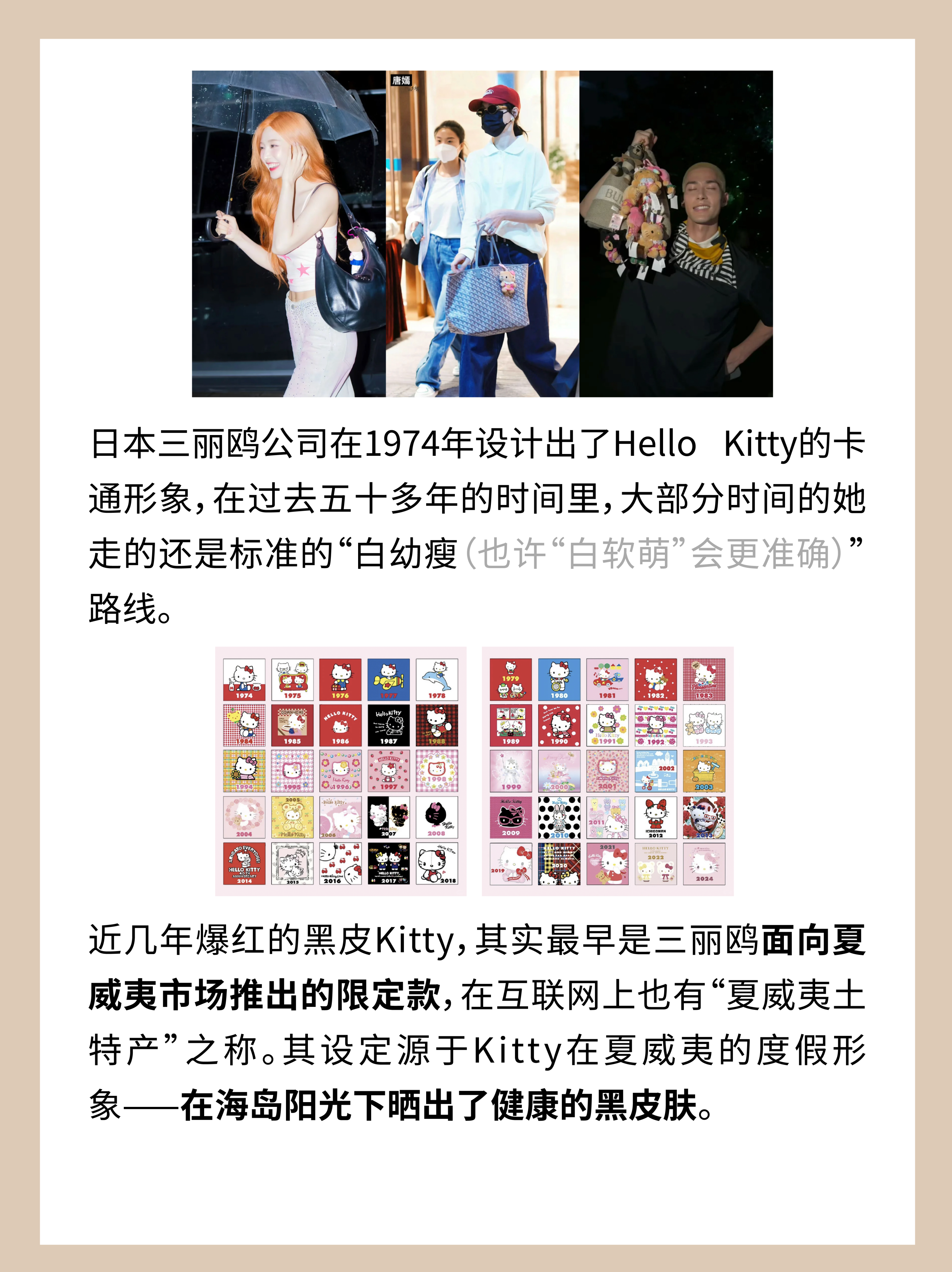 最近一年来,“黑皮”潮玩实在太多了。在这股风潮里,最有代表性的IP或许就是Hello Kitty。不少艺人把黑皮Kitty包挂融入日常穿搭,这只带着古铜色皮肤的Kitty获得了远超以往的曝光。