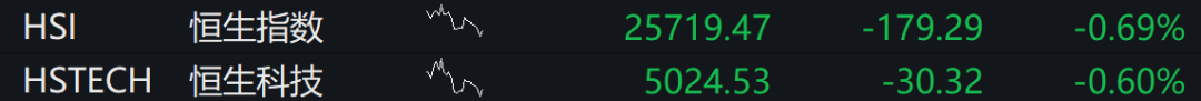 恒生指数低开0.69%,恒生科技指数跌0.6%。科网股多数走低,腾讯音乐跌近4%,哔哩哔哩跌逾2%,阿里巴巴、蔚来、快手跌幅靠前。