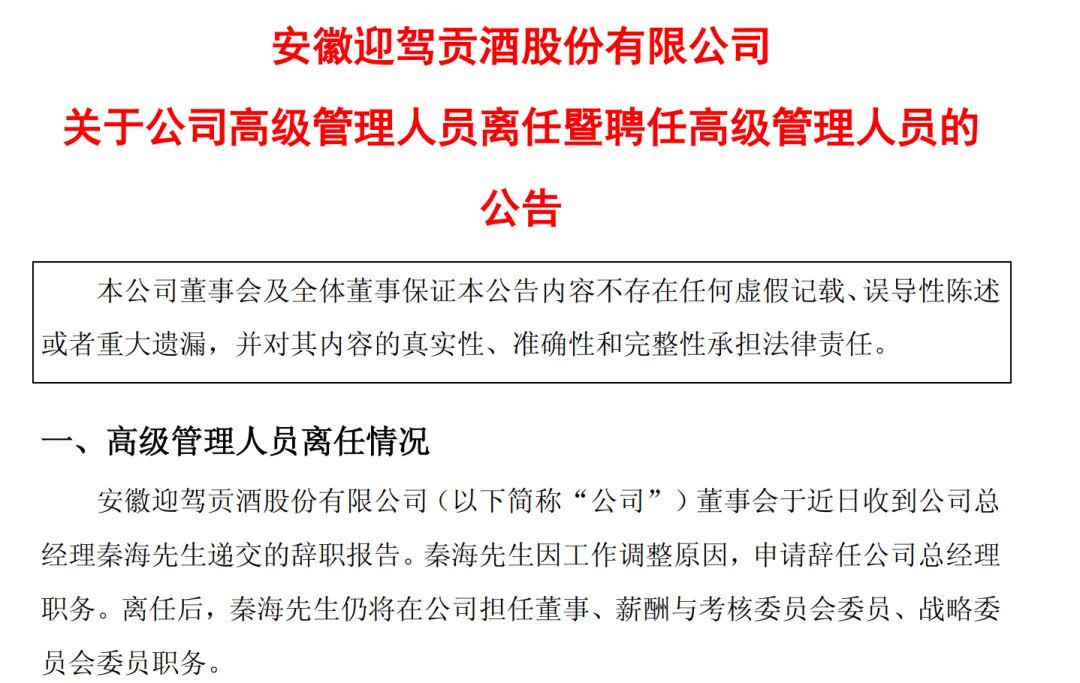 3月10日晚间,迎驾贡酒(603198)突发高管变动公告,公司总经理秦海因“工作调整”申请辞任,提前半年结束原定任期,之后仍保留董事、薪酬与考核委员会委员等职务。