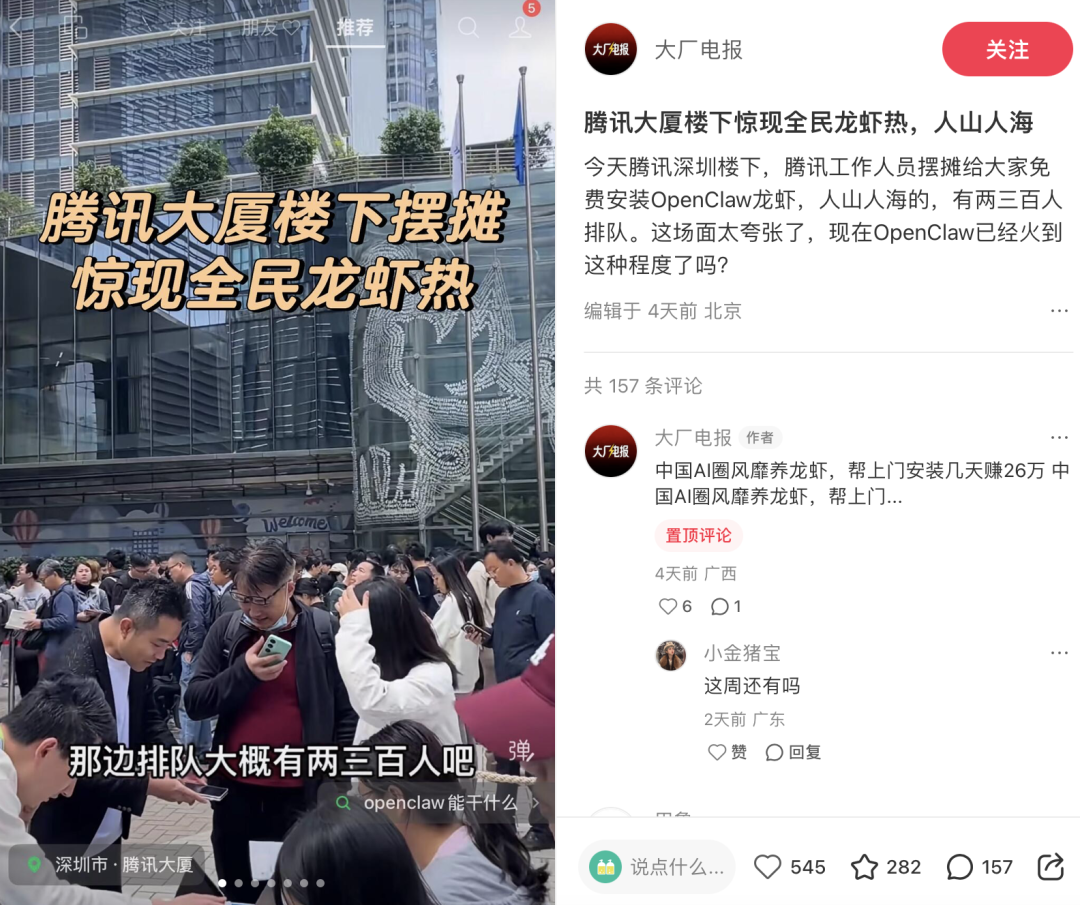 紧接着,小红书、抖音出现了龙虾的安装教程、实测分享等内容,闲鱼冒出了“龙虾部署一对一服务”,定价从几十到几百不等。养龙虾从技术话题变成了搞钱风口,社交裂变让热度进一步扩散。