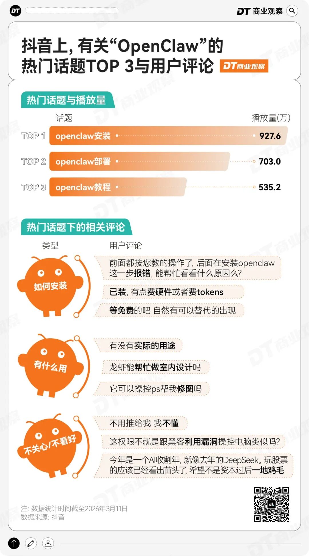 结合微博上的热搜话题和抖音的讨论话题来看,我们发现,微博是舆论场,一定程度上决定了人们讨论龙虾的事件风向;抖音则更像是普通人的交流圈,人们在这里分享怎么装、好不好用、值不值得折腾。