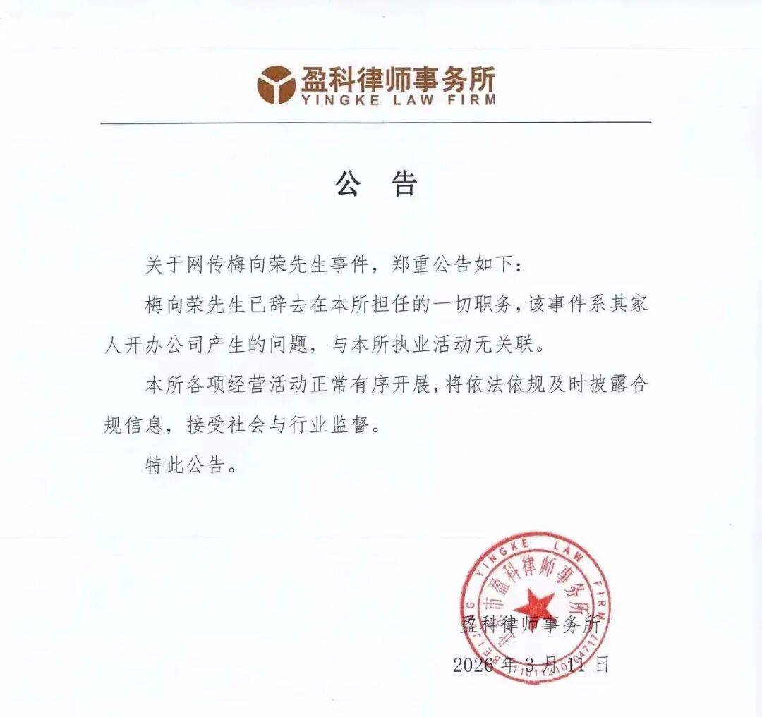3月11日晚,盈科律师事务所发布公告回应了关于网传的“梅向荣先生事件”。公告称,梅向荣先生已辞去在本所担任的一切职务,该事件系其家人开办公司产生的问题,与本所执业活动无关联。本所各项经营活动正常有序开展,将依法依规及时披露合规信息,接受社会与行业监督。