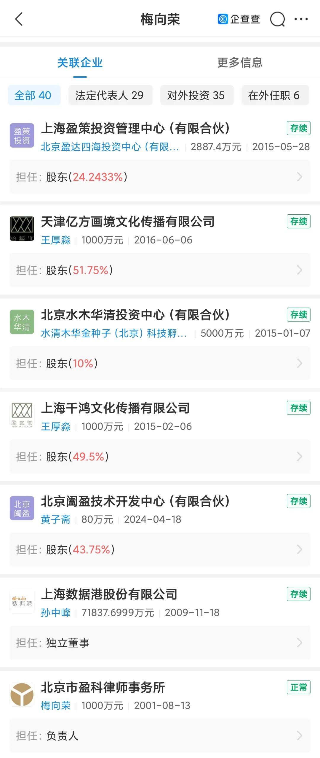 从公开信息可以看到,梅向荣的身份不止是律师。据企查查信息显示他曾在29家公司担任法定代表人,35家公司担任股东,涉足汽车、地产、投资等多个行业。