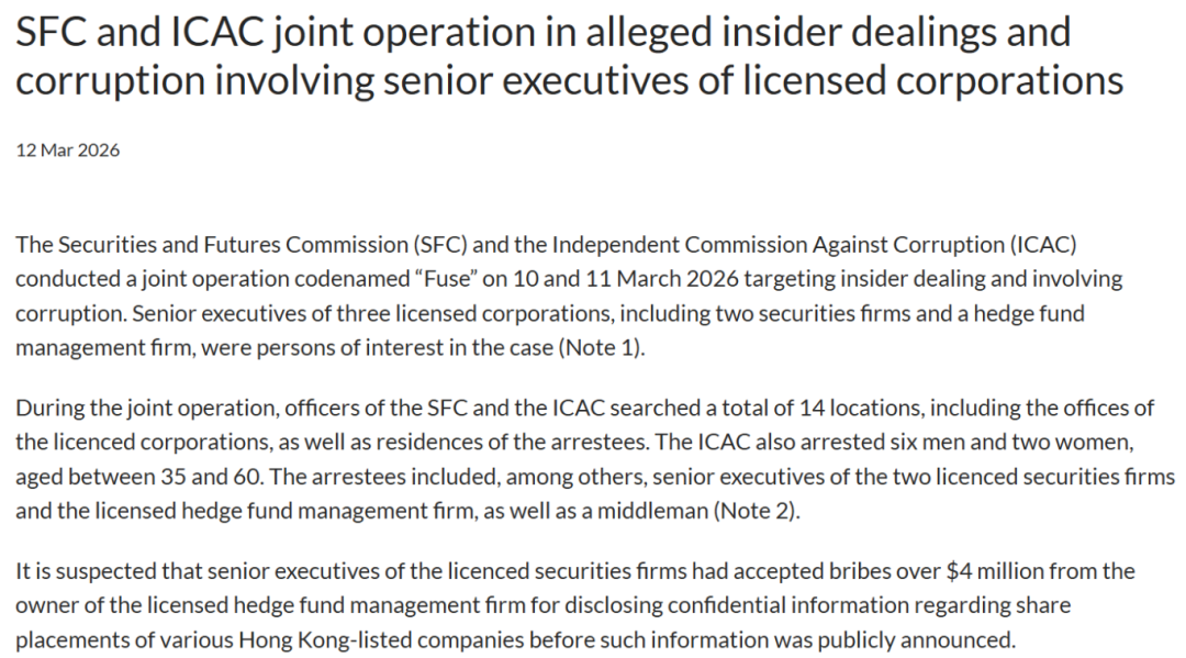 在其他执法案例中,2024年5月,香港证监会曾就涉嫌内幕交易,对对冲基金Segantii Capital Management提起诉讼。