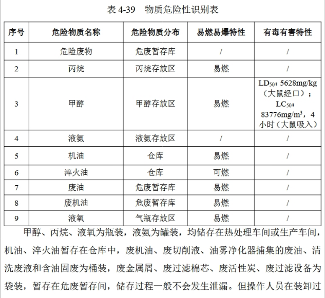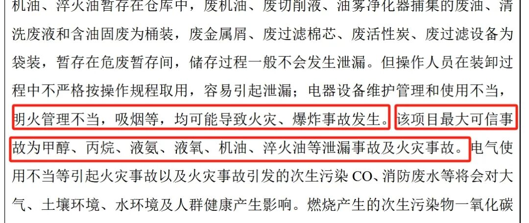 在生产过程中,冈田智能厂区存放有包括甲醇、机油、丙烷乃至废机油等易燃物。上述冈田智能的项目环境评估报告称,“明火管理不当,吸烟等,均可能导致火灾、爆炸事故发生。该项目最大可信事故为甲醇、丙烷、液氨、液氧、机油、淬火油等泄漏事故及火灾事故”。