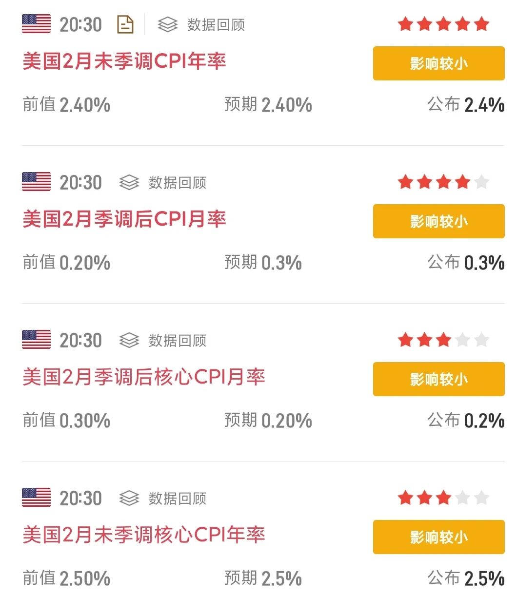 美国最新通胀数据出炉,2月季调后CPI环比上涨0.3%,同比上涨2.4%,核心CPI环比上涨0.2%,同比上涨2.5%,均符合市场预期。