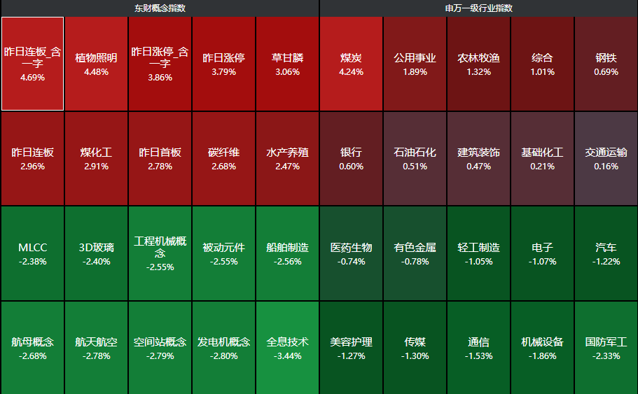 分行业来看,煤炭、公用事业、农林牧渔、综合、钢铁等行业领涨,国防军工、机械设备、通信等行业领跌。