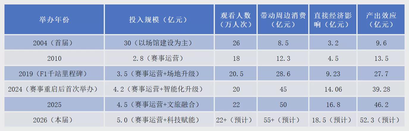 统计数据显示,F1中国大奖赛的经济拉动效应呈现逐年攀升的态势。2004年首届赛事带动周边消费仅8.5亿元,而到2025年这一数字已突破50亿元,21年间增长近5倍;直接经济影响从3.2亿元增长至16.8亿元,产出效应从9.6亿元增长至46.2亿元,彰显了顶级赛事的强大商业价值。