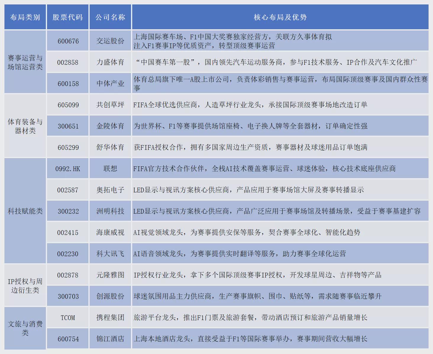 其中,交运股份(600676)作为上海国际赛车场和F1中国大奖赛的独家经营方,其关联方是赛事的直接主办方,正计划置入包含F1赛事IP在内的优质文体资产,实现从传统交通运输企业向顶级赛事运营企业的转型,长期价值有望得到重塑。