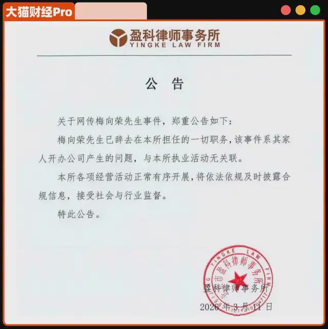 3月11日,盈科在官网挂出公告,老梅已经辞职,“事件系其家人开办公司产生的问题”,与盈科无关,与此同时,官网的律师团队里,已经搜不到老梅的名字。