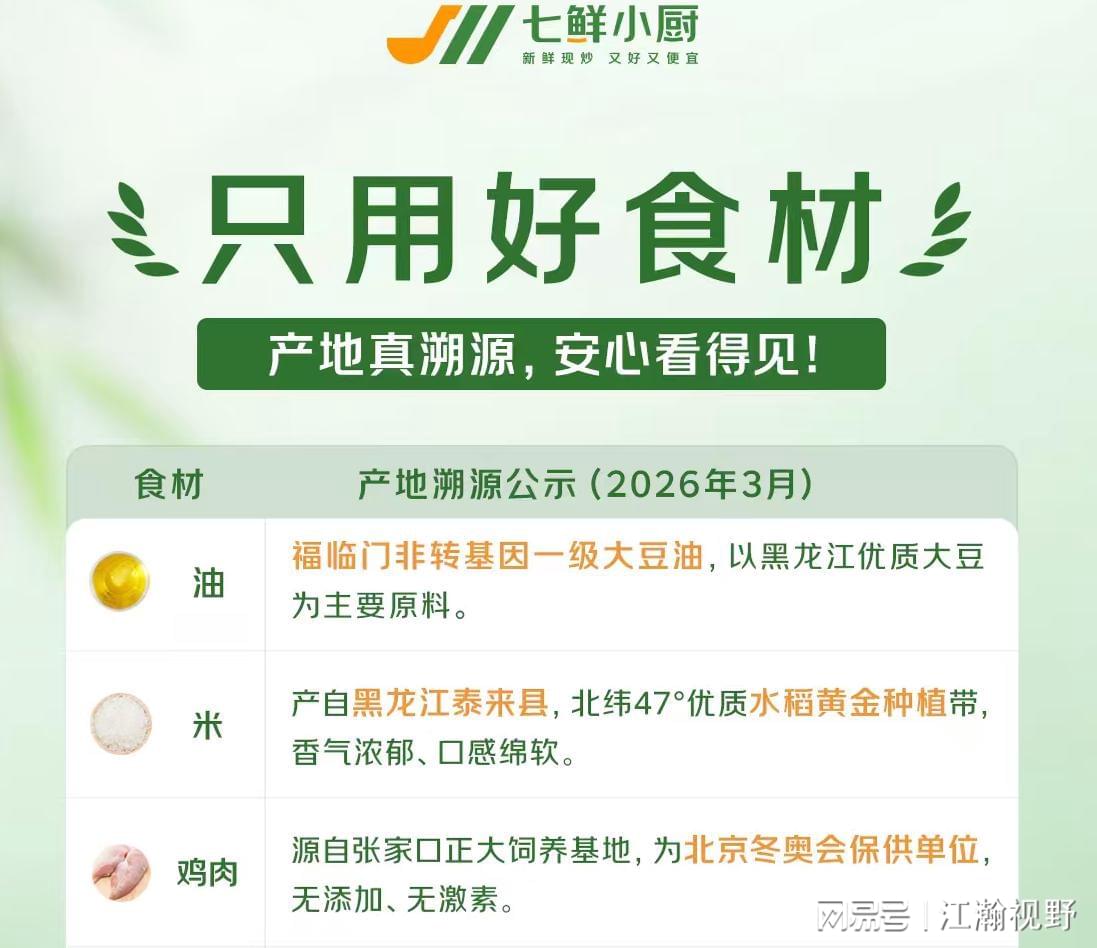 3月12日,京东集团旗下餐饮品牌七鲜小厨宣布全面公开油、米、肉、菜等核心食材的原产地,继2025年10月公示核心食材供应商后,进一步打通食材溯源链路,以全流程透明化举措回应消费者对食品安全的核心诉求。
