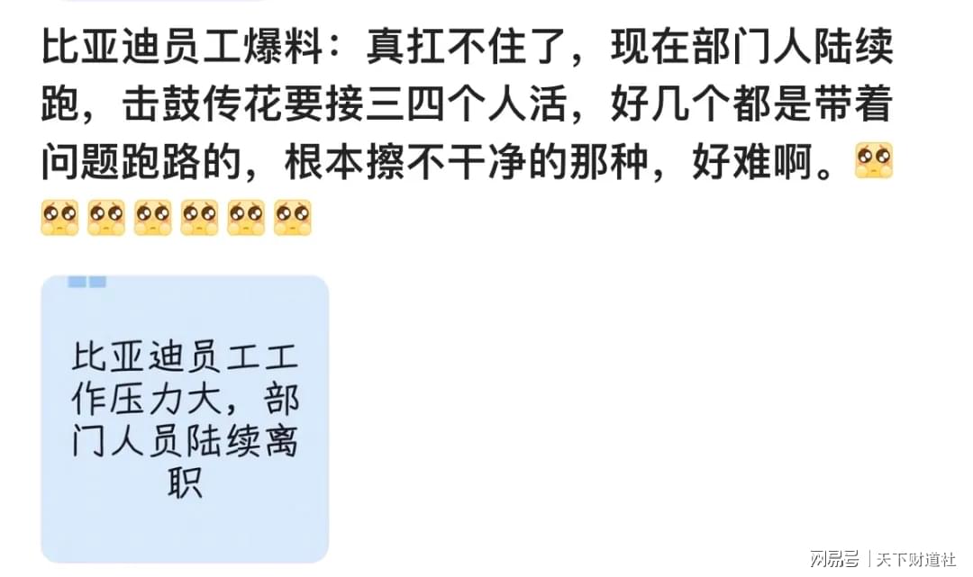 同样在2026年2月,比亚迪因“全员绩效下降40%”的网传信息引发关注。一位自称比亚迪员工在网络平台爆料,所在部门出现人员集中离职的情况,自己需要接手三四名离职同事的全部工作,直言“真扛不住了”。