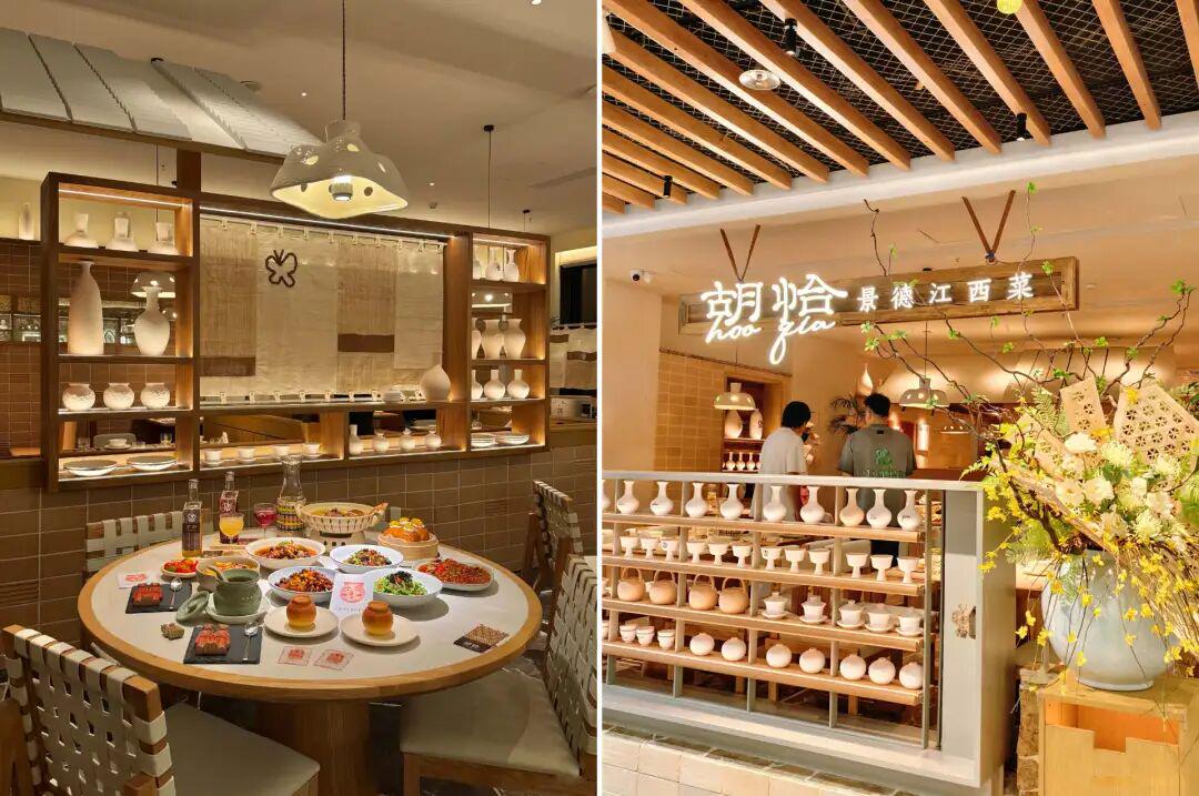 而近一年来,更多品牌跟进了最流行的Bistro风与山野风,在结合当地文化特色来营造餐厅。比如景德镇菜胡恰,融合景德镇瓷器美学,打造森林系空间。