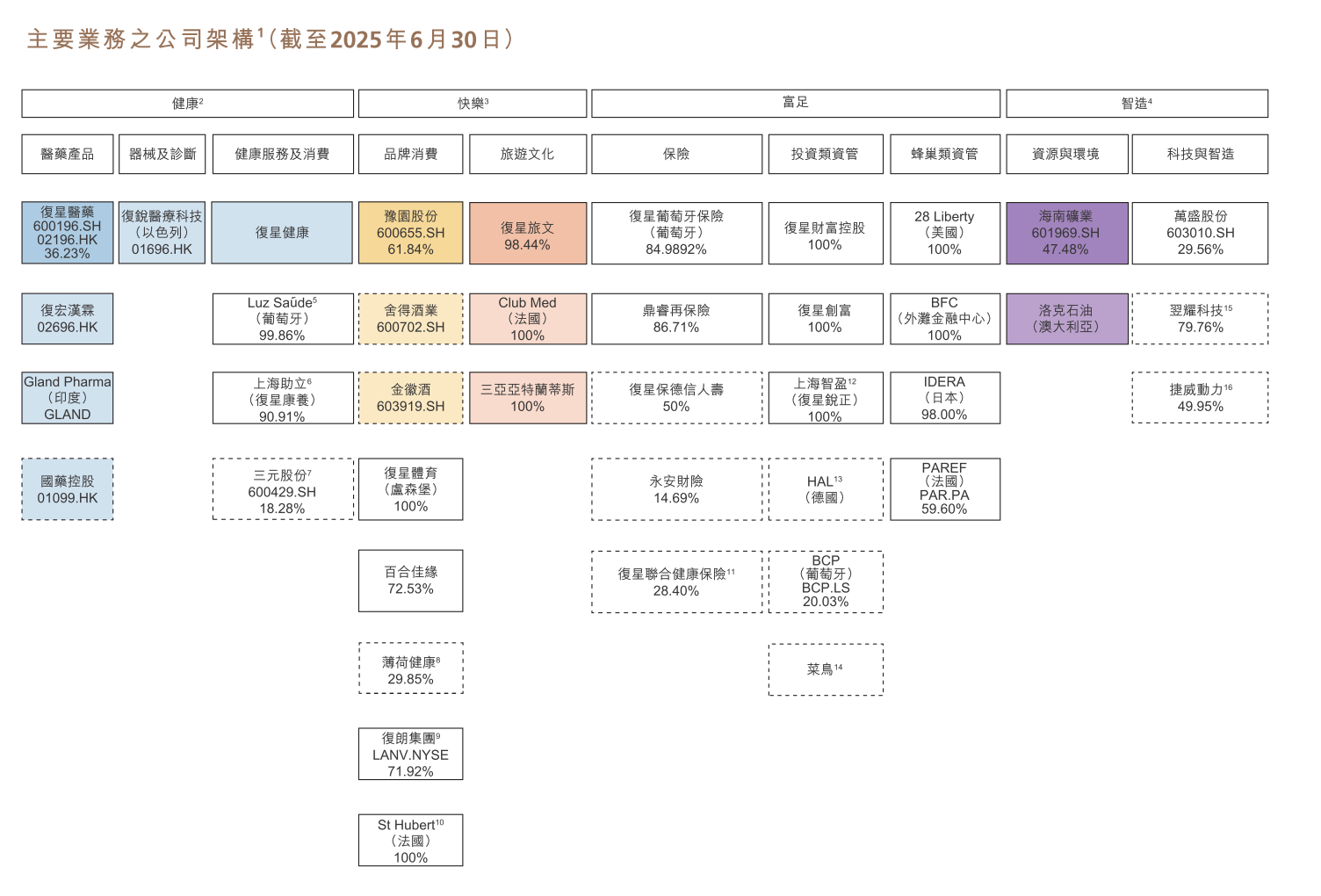 作为国内屈指可数的大型产业资本集团之一,复星国际业务横跨医药、地产、金融和科技等板块,据2025年中报数据,复星国际总资产超过7356亿元,复星国际财报并未严格依照传统的行业标准划分业务,而是划分为“健康”“快乐”“富足”“智造”四大板块。