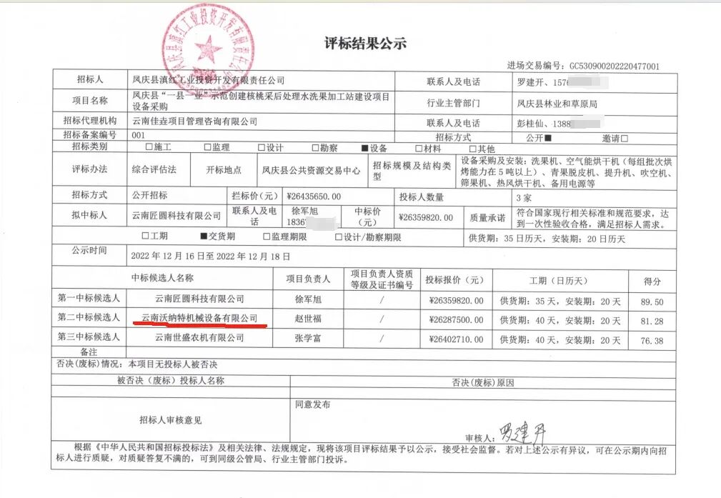 上图画红线处的公司名为云南沃纳特机械设备有限公司(下称沃纳特公司),这家公司参与了此次招标得分第二未能中标。