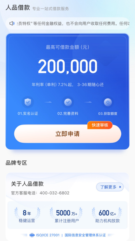 此外,令人疑惑的是,人品借款和好会借APP上均显示,不参与也不开展与贷款审核及放款相关的任何业务。但两款APP上均显示最高可借20万元,年利率7.2%起,很容易让消费者误认为两个APP平台就是借款平台。这种宣传方式是否存在误导消费者的嫌疑?
