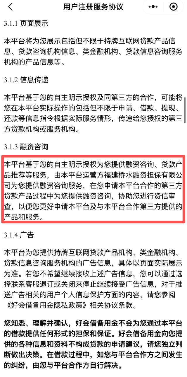 好会借备用金,提供的服务包括将借款人授权给第三方贷款机构、融资咨询、贷款产品推荐等服务,并低调展示了由洪浩控股的福建桥水的身份,“为用户提供融资咨询,并协助进行资信审查,以便申请该平台及与第三方平台提供的产品和服务”。