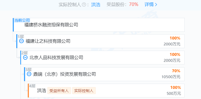 洪浩旗下的金融版图不止人品科技,还包括成立于2023年9月的福建桥水融资担保有限公司(下称“福建桥水”),注册资本2000万元,洪浩为公司实控人,持股比例为70%。