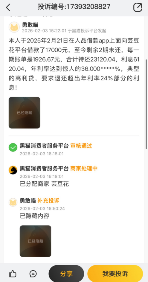 还有用户投诉称,2025年2月21日通过人品借款APP在芸豆花平台借款1.7万元,剩余2期未还,每一期账单是1926.67元,合计待还23120.04元。假设按照12个月借款期限测算,其年化利率为36%。