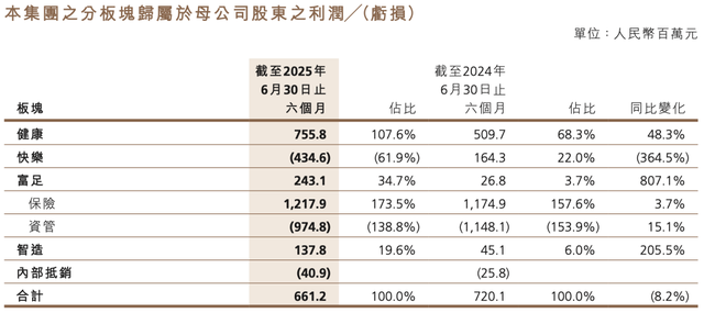 而从盈利情况来看,利润贡献最高的是健康板块,2025年上半年归母净利润7.56亿元,同比增长48.3%;增速最快的是富足板块,2025年上半年归母净利润2.43亿元,同比增长807.1%;智造板块同比增长205.5%,录得归母净利润1.38亿元;快乐板块则出现亏损,净亏损4.35亿元,同比减少364.5%。