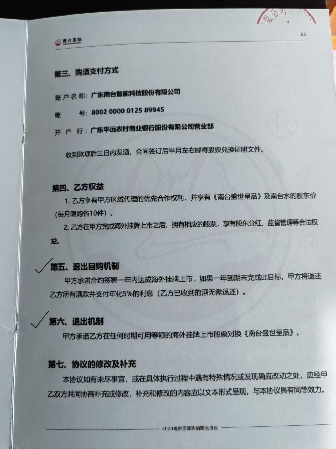 根据南台国际2020购酒赠股权协议合同,南台国际承诺合约签署一年内达成海外挂牌上市,如果一年到期未完成此目标,将退还消费者所有酒款并支付年化5%的利息,消费者已收到的酒无需退还。在南台国际完成海外挂牌上市之后,消费者拥有相应的股票,享有股东分红、监督管理等合法权益。