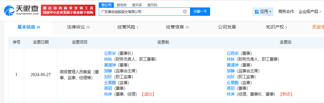 红星资本局注意到,南台国际关联关系较为复杂,另一家名为广东南台控股股份有限公司(以下简称“南台控股”),注册地也位于广东省梅州市平远县,其实际控制人为丘胜安,而丘胜安也曾出现在南台智能科技高级管理人员备案名单中。