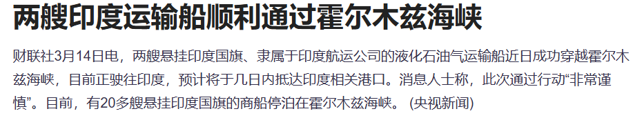 据报道,由于中东冲突持续,印度仍有约20艘油轮滞留在霍尔木兹海峡附近。知情人士透露,印度目前正与伊朗方面进行新一轮紧急谈判,以确保船只安全通行。最新报道两艘悬挂印度国旗、隶属于印度航运公司的液化石油气运输船近日成功穿越霍尔木兹海峡,目前正驶往印度,预计将于几日内抵达印度相关港口。