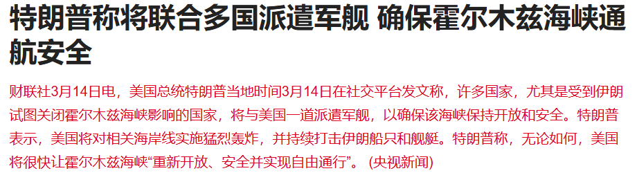 美国总统特朗普在社交平台发文称,许多国家、尤其是受到伊朗试图关闭霍尔木兹海峡影响的国家,将与美国一道派遣军舰,以确保该海峡保持开放和安全。他表示,美国将对相关海岸线实施猛烈轰炸,并持续打击伊朗船只和舰艇。