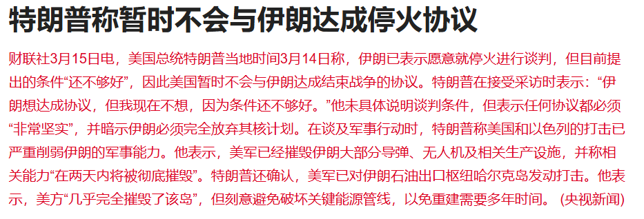 美国总统特朗普当地时间3月14日称,伊朗已表示愿意就停火进行谈判,但目前提出的条件“还不够好”,因此美国暂时不会与伊朗达成结束战争的协议。