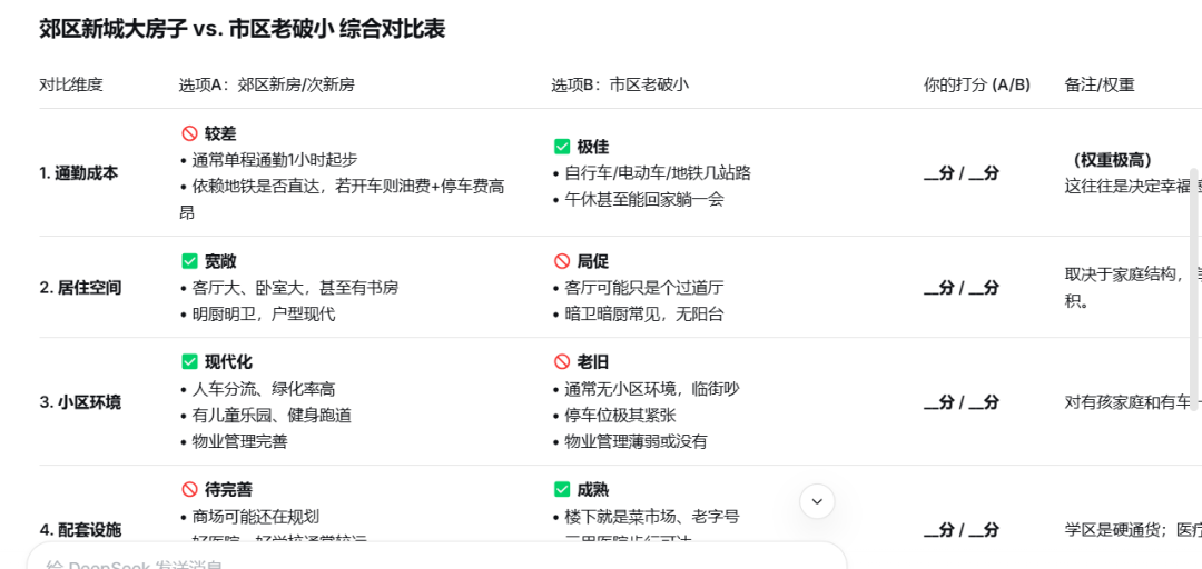 DeepSeek:「郊区新房vs市区老破小,做个对比表,方便我打分决策」