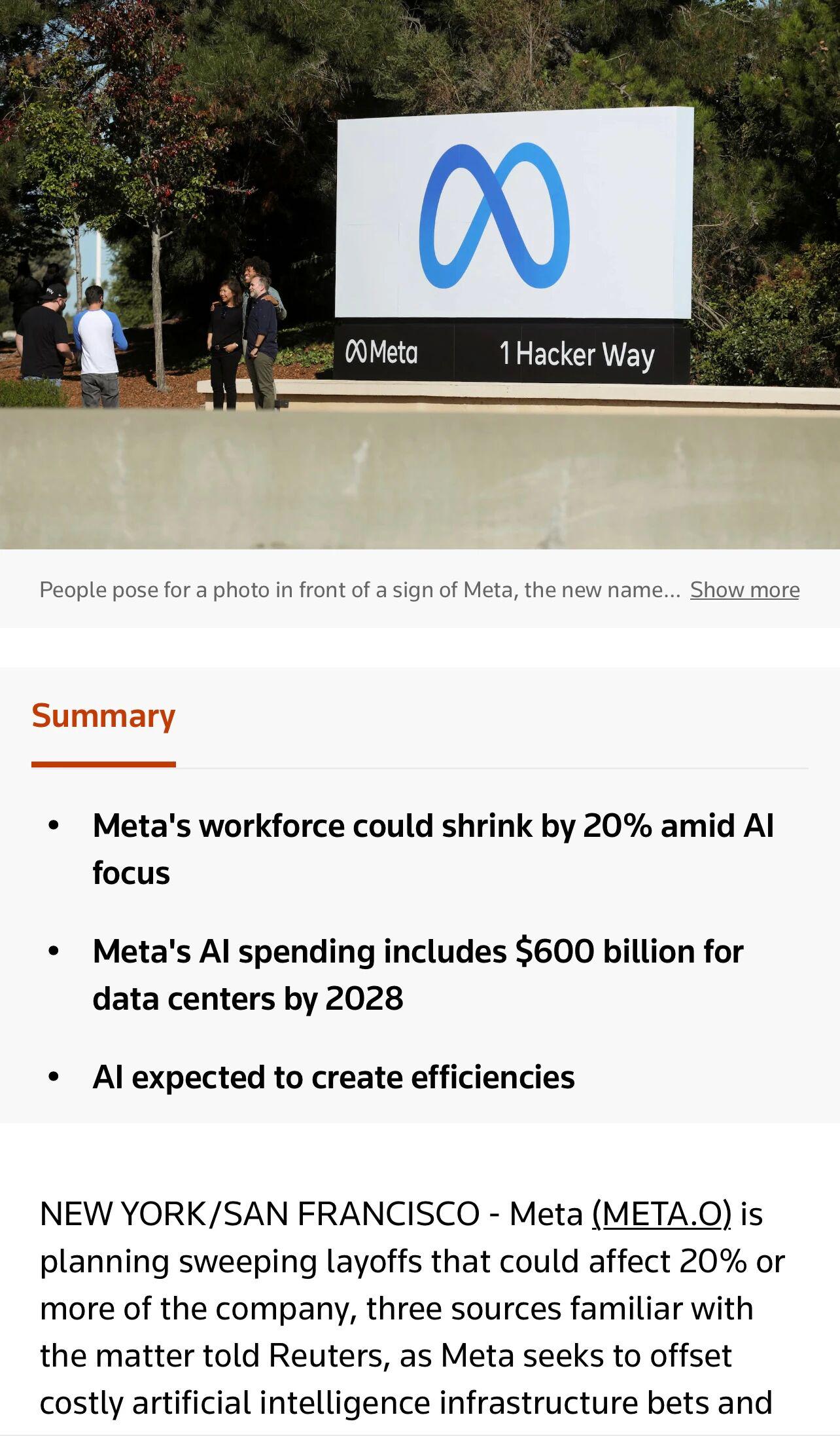 据多家权威媒体最新报道,Meta 正在内部讨论一轮大规模裁员计划,裁员规模可能达到公司员工总数的20%甚至更高,以应对人工智能基础设施投资带来的巨大成本压力,并推动公司向AI驱动的精简组织结构转型。