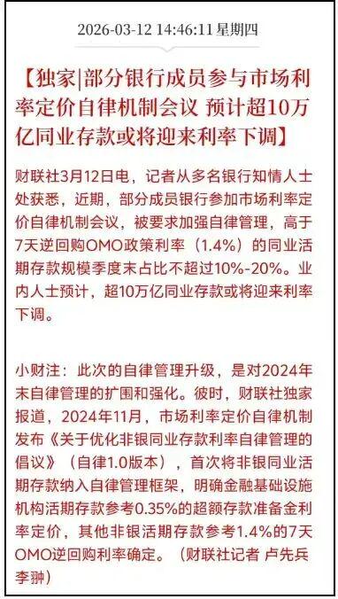 3月12日,市场利率定价自律机制对银行下达了新的要求 : 同业活期存款(银行之间互相存放的短期资金)中,利率高于7天逆回购政策利率(1.4%)的部分,季末占比不得超过10%-20%。