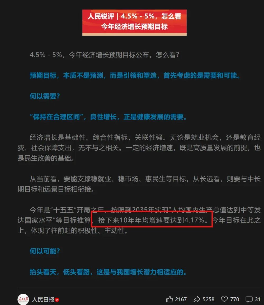根据人民日报评论文章 ,要实现2035年远景目标,"十五五"和"十六五"期间年均GDP增速只需要4.17%。