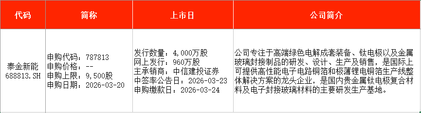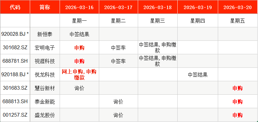 从时间表看,宏明电子(301682)、视涯科技(688781)、悦龙科技(920188)等在本周一(3月16日)申购;慧谷新材(301683)、泰金新能(688813)、盛龙股份(001257)等在本周五申购。