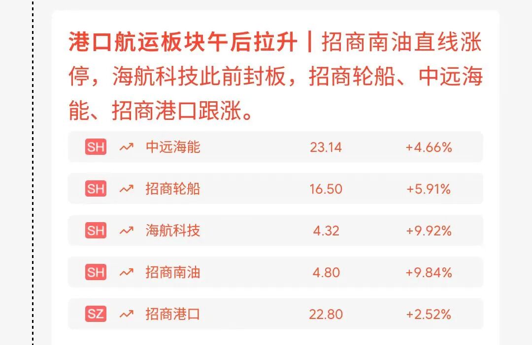 招商南油直线涨停,海航科技此前封板,招商轮船、中远海能、招商港口跟涨。