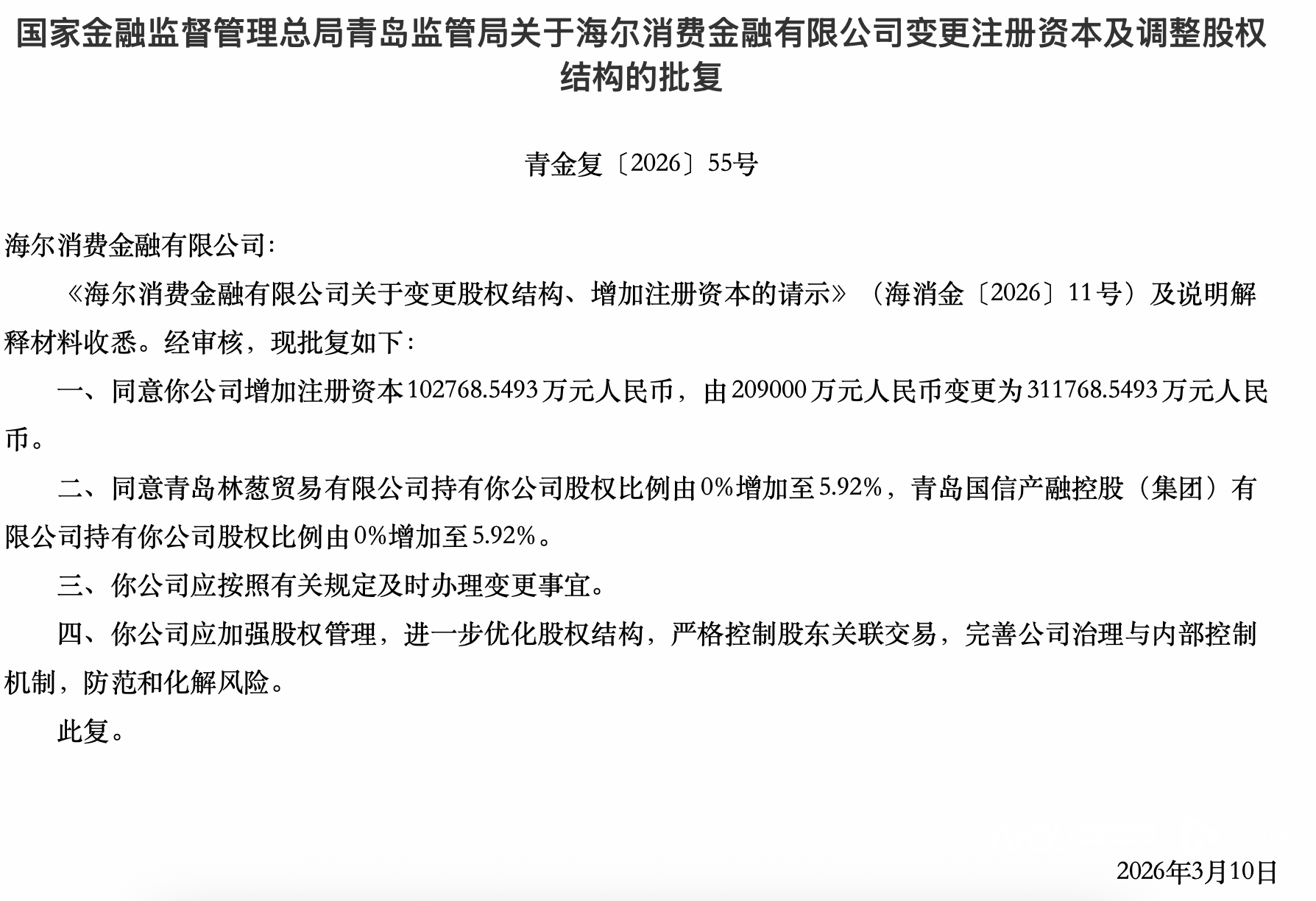 3月16日,海尔消费金融获监管批复,新增注册资本金超10亿元,成为2026年继北银消费金融、湖北消费金融、金美信消费金融之后第四家完成增资的持牌消费金融公司。经过本次增资,海尔消费金融注册资本金由20.9亿元增至约31.18亿元。