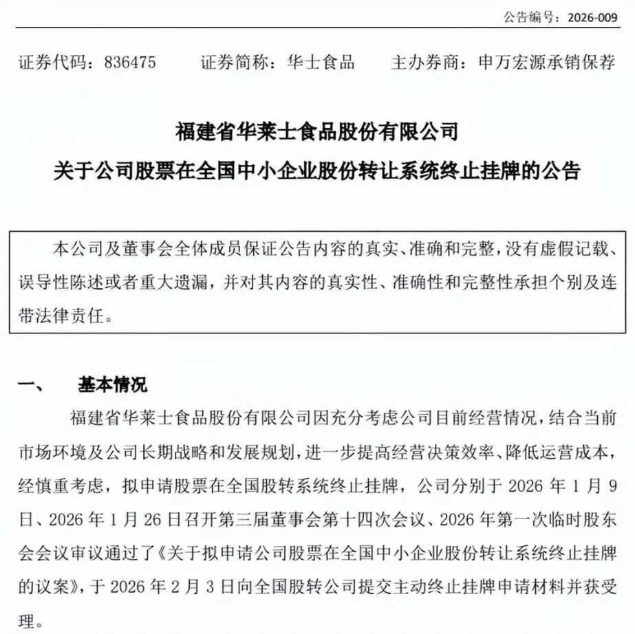 华莱士母公司福建省华士食品股份有限公司(以下简称“华士食品”)在新三板悄然退市,正式告别这个待了近十年的资本市场。
