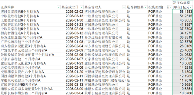 wind数据显示,2026年开年以来,至少已有超过10只FOF实现一日售罄。以最新案例看,中欧盈欣稳健6个月持有混合新发规模51.25亿元,暂列今年以来第二只新发规模超过50亿元的FOF产品。博时盈泰臻选6个月持有A暂列FOF发行规模榜首,新发规模为58.44亿元。